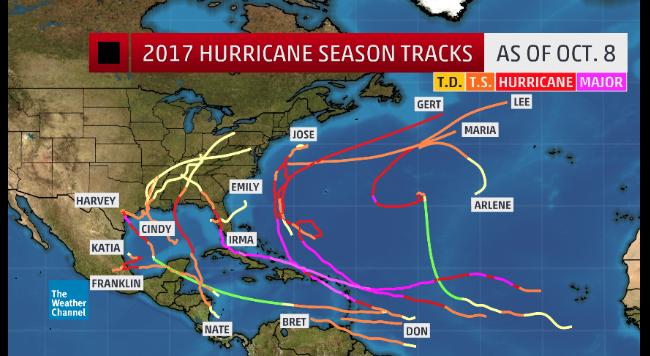 2017 Atlantic hurricane season tracks-to-date, through October 8, 2017.